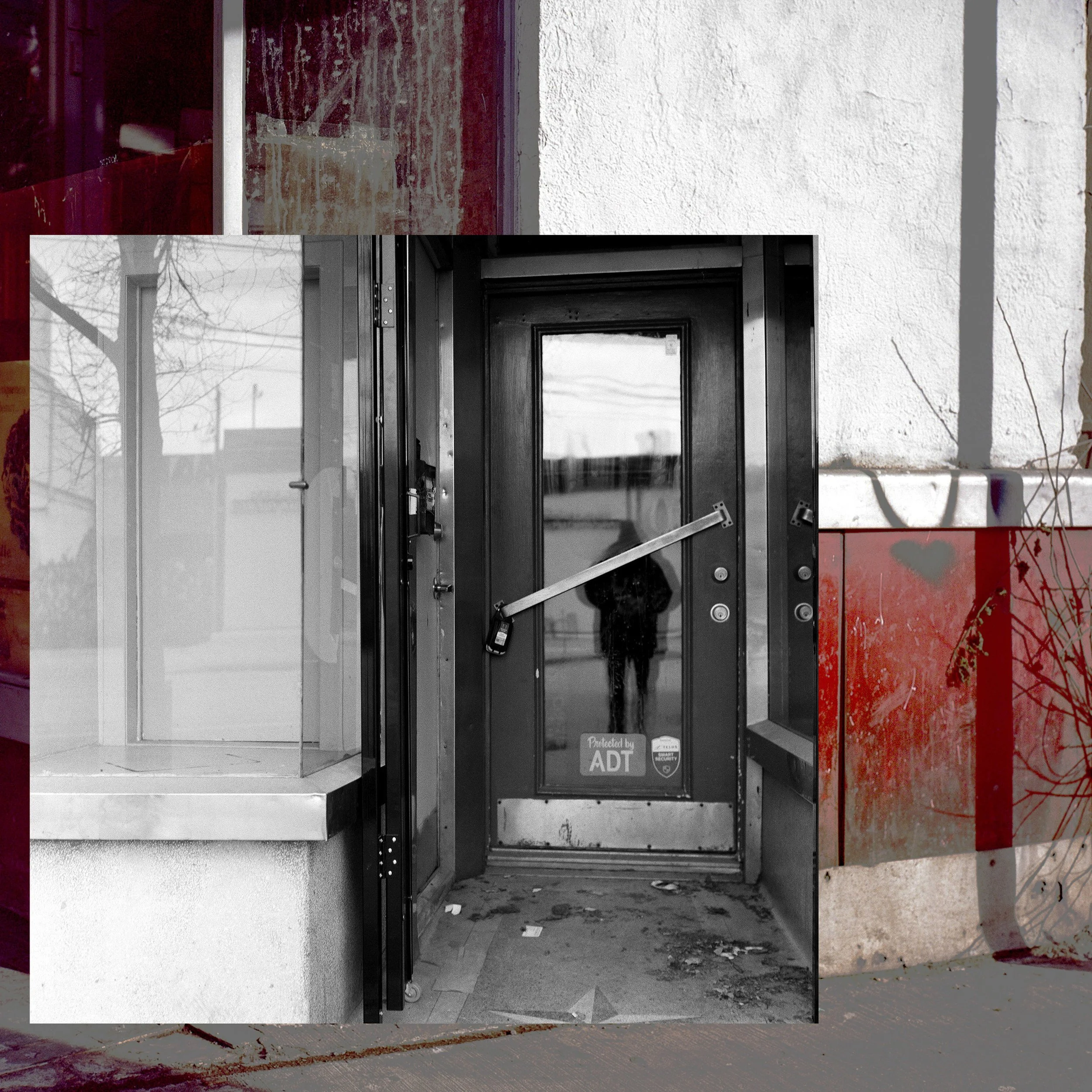 In August 2025, I exhibited a large outdoor mural at the Alleyway Gallery, Toronto entitled City Block: Liminal Spaces. That work included four black and white images of empty storefronts from each of the defining streets in the background and five colour images from the laneways in between.