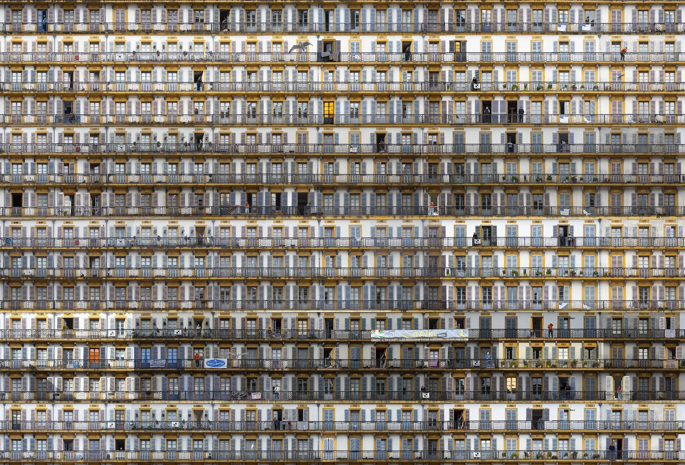 Inspired by the historic Plaza de la Constitución in San Sebastián, Spain, this surreal façade comprises 147 windows and balconies, transforming traditional three-story buildings into an 18-floor architectural illusion with 866 windows. By stacking layers of urban space, the piece explores themes of density, growth, and the evolving needs of contemporary society. The towering structure reflects the pressing demand for housing in an ever-expanding world. The work, photographed over four years at different times of day, captures shifting light and atmosphere, reinforcing the passage of time within a static, impossible form. This piece continues my exploration of urban environments, merging realism and imagination to engage the viewer to create their story.