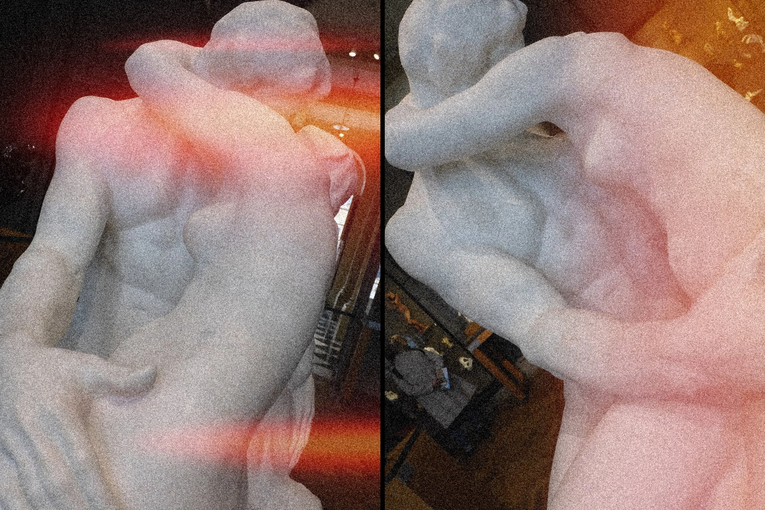The pictures in this work are a follow-up of a previous work entitled “Botero Tango”. They are a series of images shown as a short narrative on a large flat screen monitor. The images were taken at the Rodin Museum in Paris, France. The style incorporates a film “light leak” and are two half images on one frame. The effect creates an imagined dance.