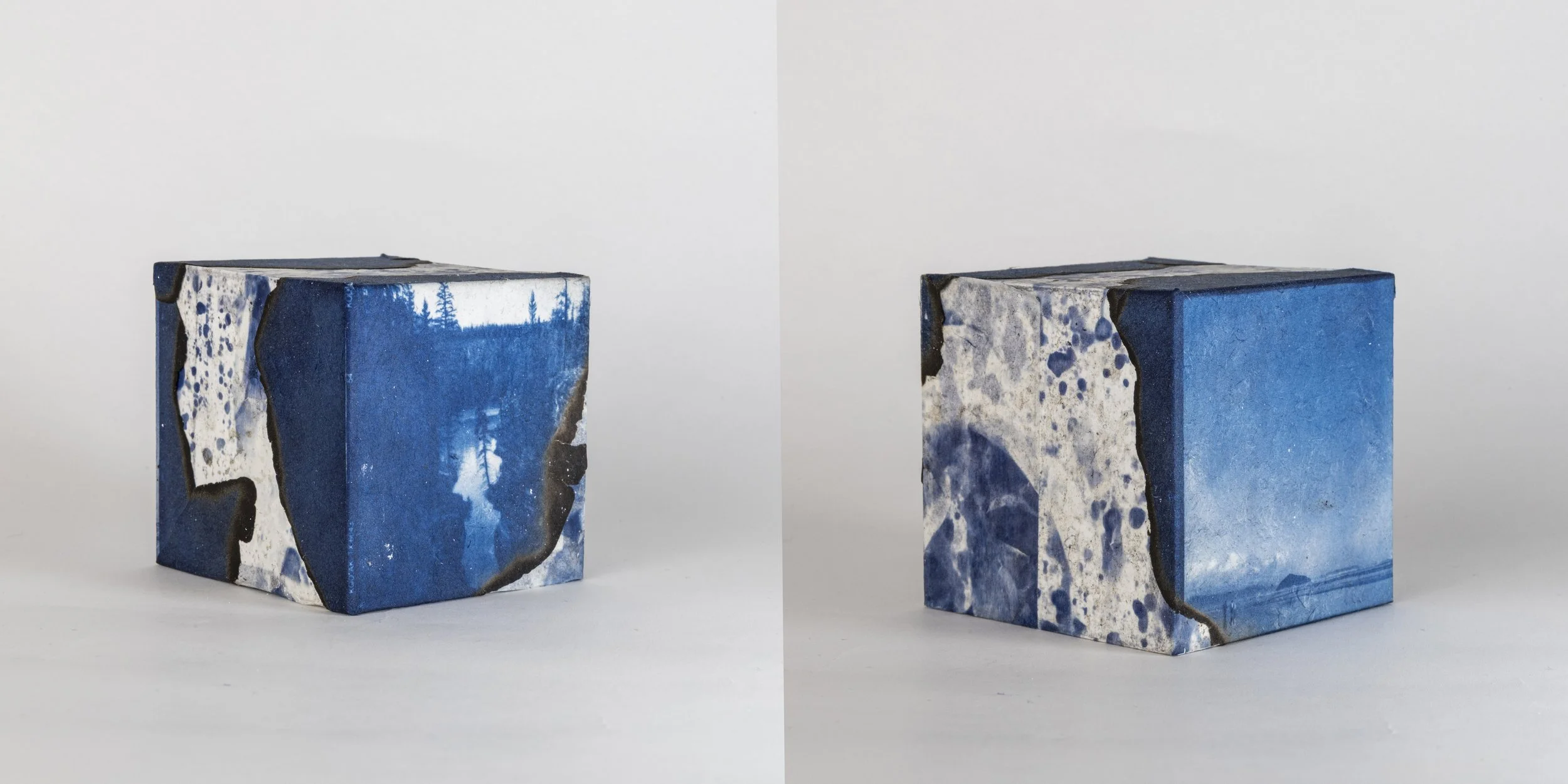 The small wall-mounted cyanotype cube is based on medium-format black-and-white photographs taken on Nanaimo Island in 1995. The island marks a pivotal turning point in my life—a site connected to departure rather than arrival. I translate this memory into a modular form, treating the cube as a condensed spatial marker rather than a narrative object. Positioned beside the larger work, the cube functions as an anchor point, quietly holding a personal origin within the exhibition space.